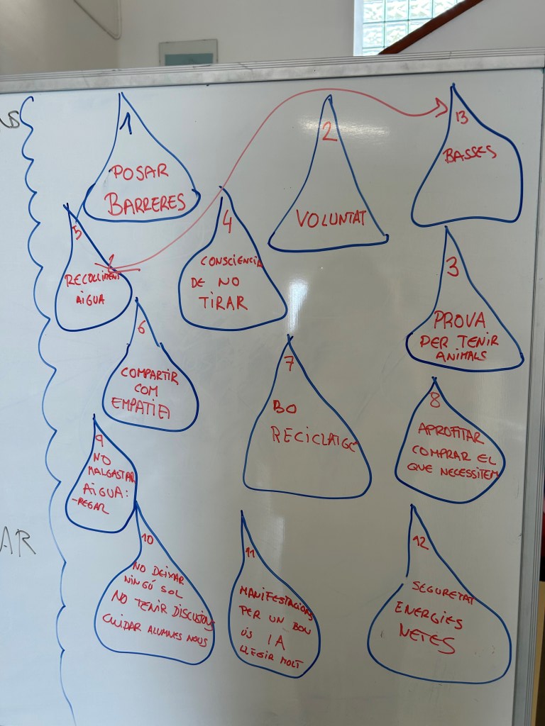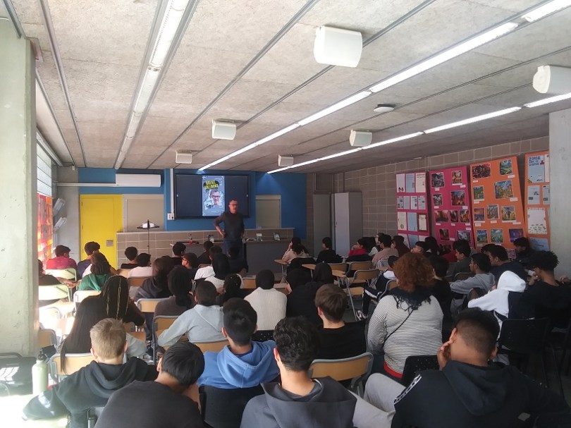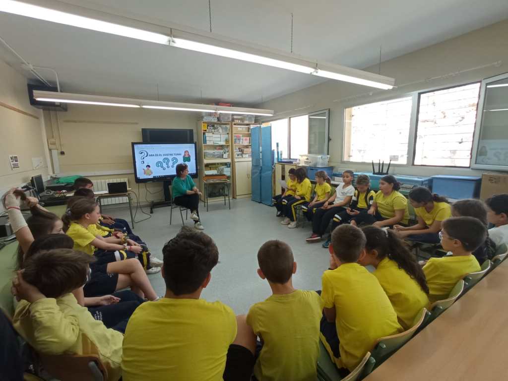 L’activitat es fa a la sala d’actes –i gimnàs- de l’escola. Els quaranta-tres nois i noies, refrescats per un parell de ventiladors, es van disposar, tant a escoltar allò que jo els havia de dir com a fer-me les preguntes que havien preparat a l’aula. Normalment, utilitzo un Power Point per acompanyar-me, em serveix de guia per a fer l’exposició, però aviat intueixo que la calor i l’hora –són dos quarts de dotze del migdia— dificultaran aconseguir la seva atenció, i faig un gir de guió convertint explicacions en preguntes que cal anar ajustant fins arribar a la resposta correcta.