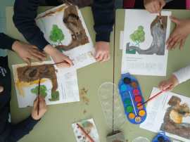 Mentre un grup assisteix a la sessió, l’altre s’entreté dibuixant i pintant els diferents personatges del conte. Entre petits i grans imaginaran i personalitzaran també tots els elements que intervenen al procés de la verema, i en sortirà així un gran mural que penjaran al pati. El matí passa ràpid i les emocions fan venir gana. Així, com qui no vola cosa, arriba el moment d’obrir les carmanyoles. Moment també d’acomiadar-me i de donar la benvinguda al grup musical que clourà la jornada amb un gran fi de festa com l’ocasió es mereix.