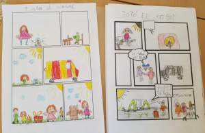 Han llegit algun dels meus relats, que he seleccionat perquè puguin ser més fàcils a Primària, i un cop més, per enèssima vegada, el conte que més triomfa és Totó, el robot, que una vegada i una altra atrau l’atenció a totes les escoles –a veure si algun editor ho llegeix i m’envia una proposta; no ho dic jo, sinó totes les escoles que he visitat i els ha agradat. I com a gran regal, m’ensenyen les il·lustracions que han fet sobre el conte, i me les emportaria totes –editors, si voleu ja està il·lustrat i tot.